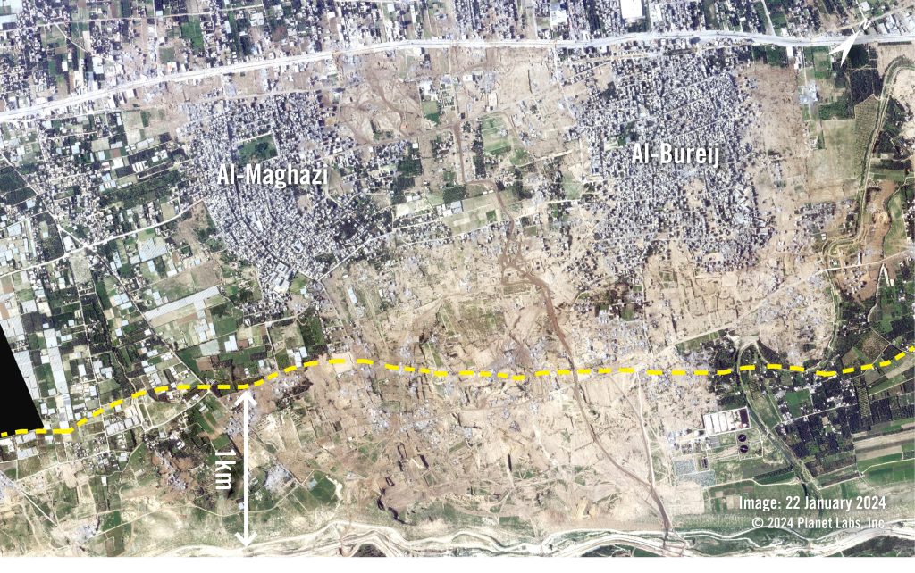 In centraal-Gaza werd het gebied rond en ten oosten van de vluchtelingenkampen Al-Bureij en Al-Maghazi met de grond gelijk gemaakt. Dat gebeurde tussen eind december 2023 en januari 2024. De tijdlijn van de vernietiging komt overeen met het offensief van het Israëlische leger in deze twee dichtbevolkte gebieden. Het leger beweerde wapens, raketwerpers en tunnelschachten te hebben gevonden. Het gaf echter geen bewijs of verklaring voor de dwingende militaire noodzaak om dorpen en landbouwgrond langs de oostgrens te vernietigen. De wapens en militaire doelen werden naar verluidt veel verder in de Gazastrook gevonden.