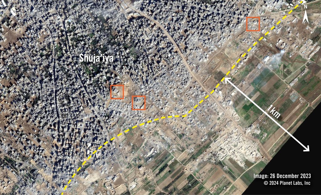 In Shuja’iya, een van de grootste wijken van Gaza-Stad, werden volgens de Verenigde Naties tussen 26 november 2023 en 6 januari 2024 meer dan 750 bouwwerken binnen de ‘bufferzone’ vernietigd of ernstig beschadigd. Daaronder waren twee scholen, moskeeën en tientallen woongebouwen. Het Israëlische leger claimde dat in sommige van die gebouwen wapens, munitie en tunnels verborgen waren, maar leverde geen bewijs.