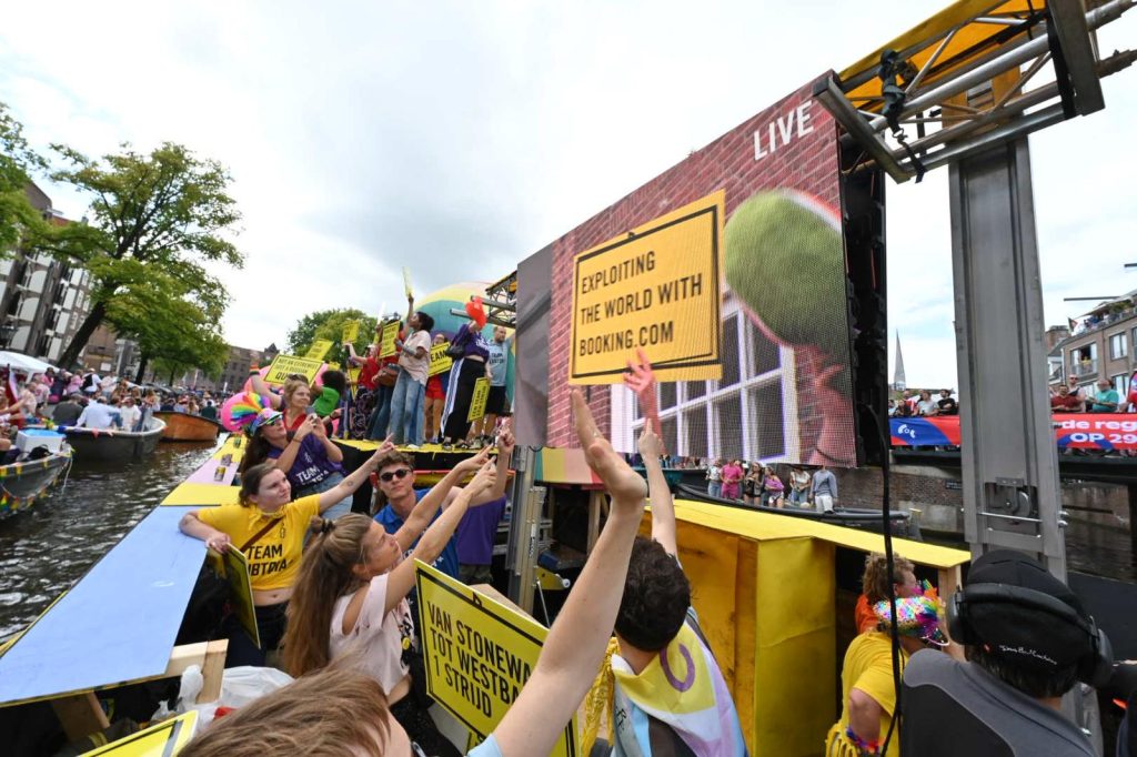 Prideboot Amnesty International toont boodschap tegen hoofdsponsor Booking.com en apartheid