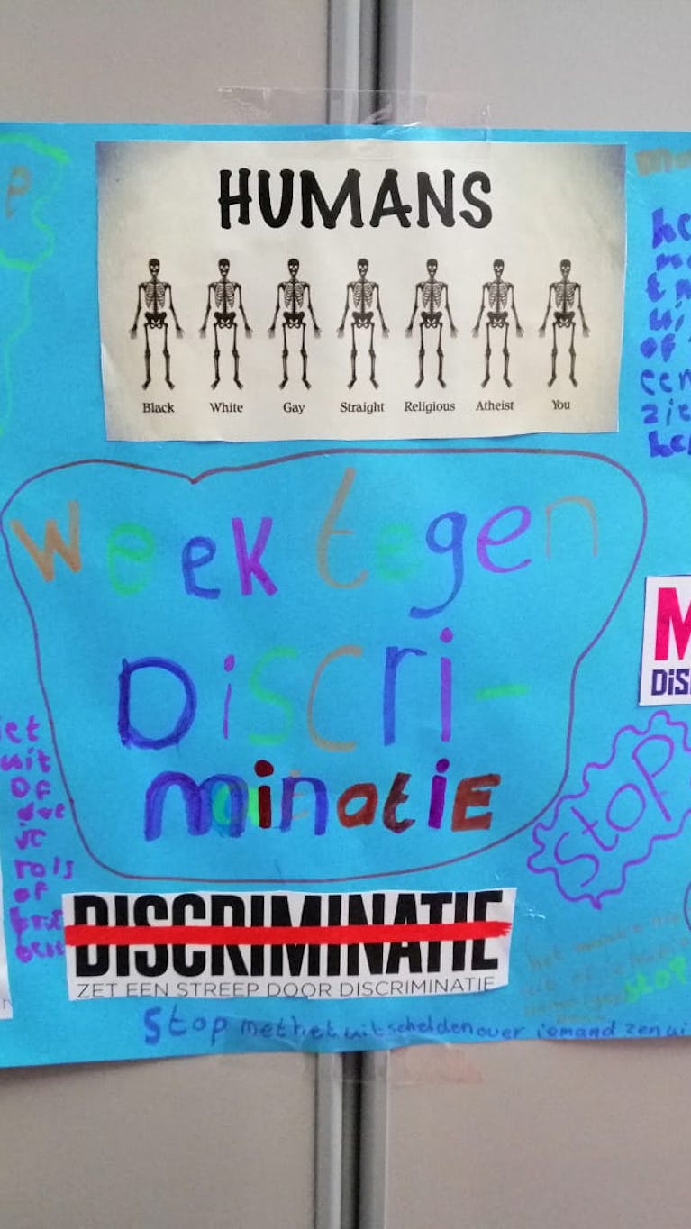 ‘Van Amnesty heb ik veel spullen gekregen die ik heb gebruikt tijdens de presentaties. Kinderrechtenpaspoortjes, pennen, posters en GRTZ kaarten. En dit alles voor 16 klassen! Elke klas begon de week met een vertelkring. Hierin is het thema ‘discriminatie’ besproken. Zo werd het thema geïntroduceerd bij de leerlingen. Om het voor de jongsten wat begrijpelijker te maken is er een vergelijking gemaakt met ‘pesten’. De leerlingen hebben een hele leuk week gehad. Ik heb er zelf ook veel van geleerd. De woorden racisme en discriminantie liggen dicht bij elkaar. Deze vind ik soms al ingewikkeld om uit elkaar te houden. Voor leerlingen van bijvoorbeeld groep drie is dit al helemaal een opgave. Het is leuk en leerzaam dat je bepaalde thema’s door hun ogen leert bekijken.’