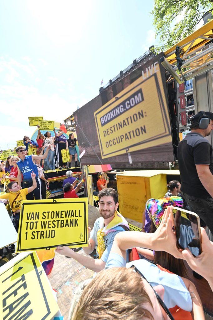 Booking.com is hoofdsponsor van de Canal Parade. Het bedrijf biedt accommodaties aan op illegale Israëlische nederzettingen in het Bezette Palestijnse Gebied. Daarmee draagt Booking bij aan een systeem van onderdrukking en apartheid ↵.