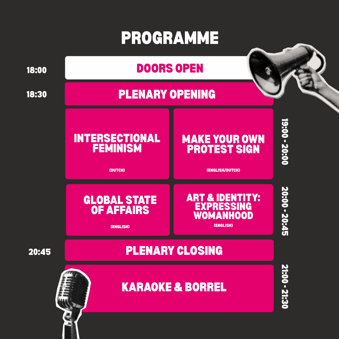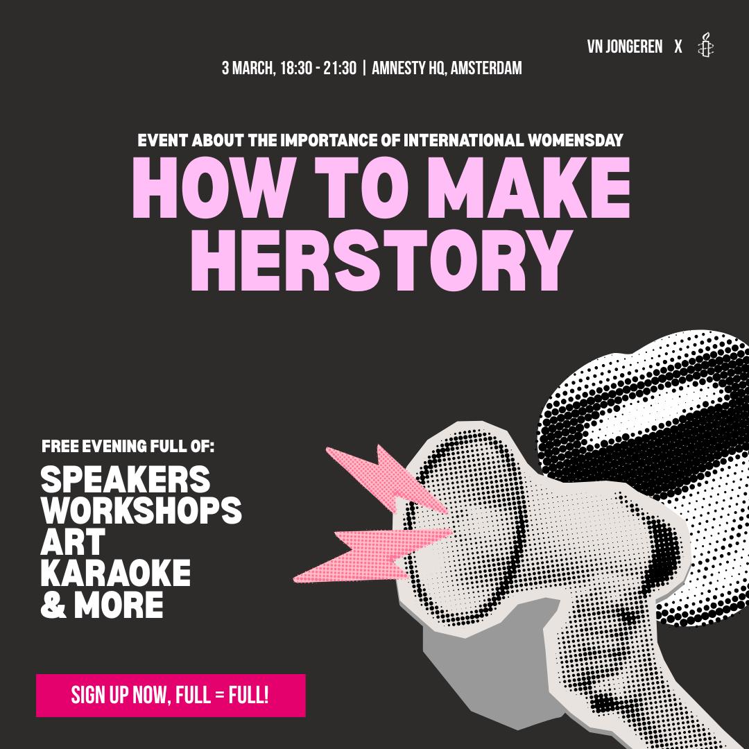 On the evening of March 3rd, the Amnesty Youth Council and Dutch Youth Council invite you to an inspiring event on women’s rights in celebration of International Women’s Day. Join us for engaging workshops on intersectional feminism, protest sign-making and global developments in the fight for women’s rights. We’ll end the evening on a high note with karaoke! The event will be hosted at Amnesty’s headquarters in Amsterdam.