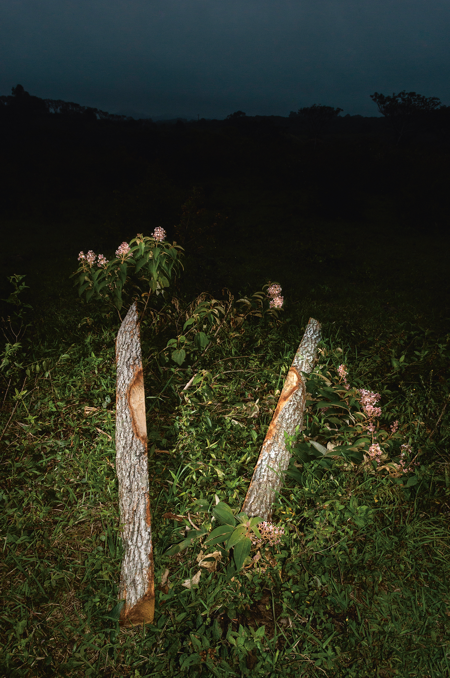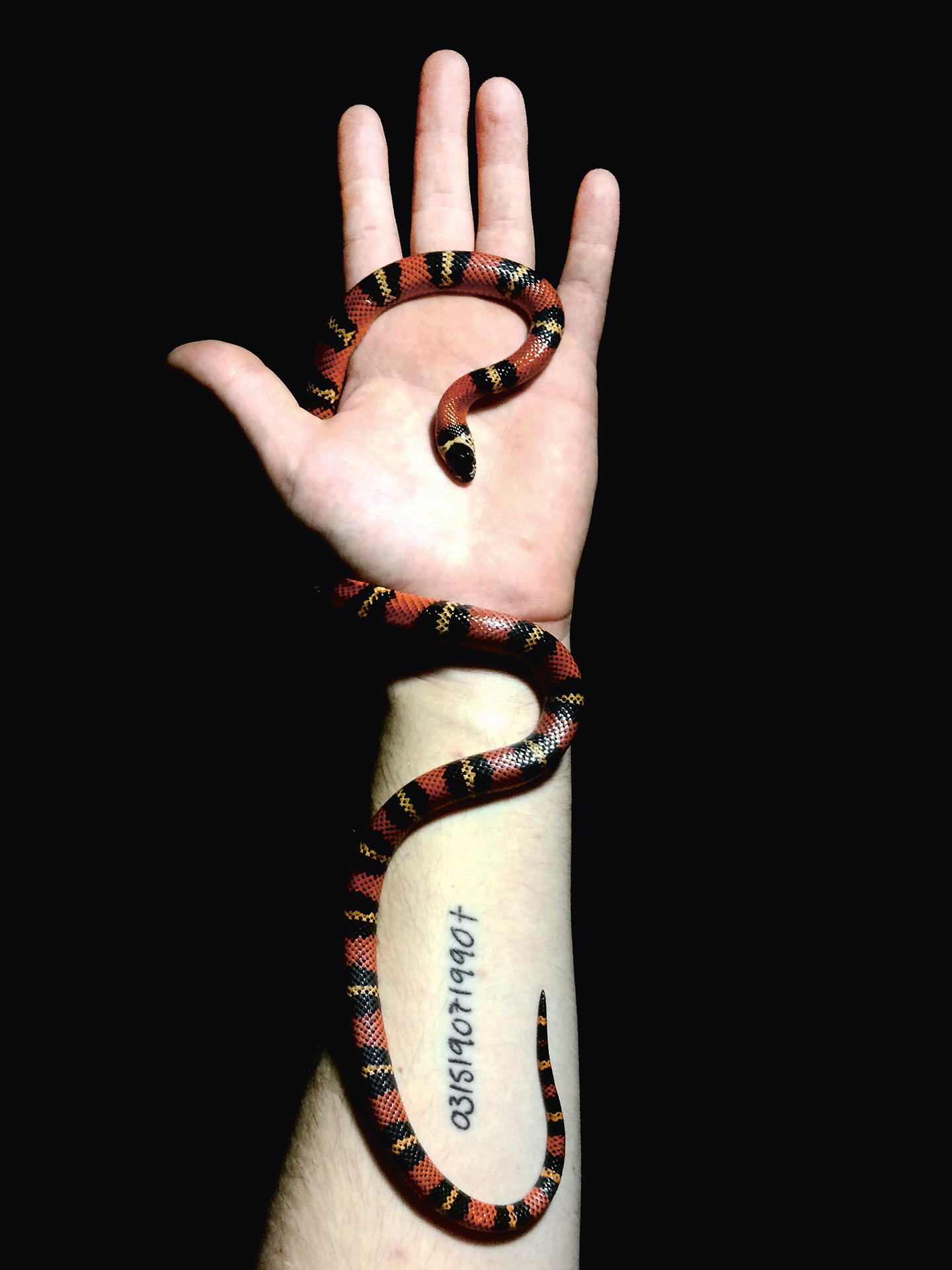 Met die vrees besloot hij de confrontatie aan te gaan. Hij maakte een fotoserie die als het ware vooruitloopt op zijn eigen verdwijning. Wat zou eraan voorafgaan? Een pistool op tafel, haastig gewiste berichtjes op WhatsApp om anderen niet in gevaar te brengen (beide echt gebeurd). Hoe zou zijn vermistposter eruitzien? Hij maakte er een. Waar zou hij dood aangetroffen worden? Hij fotografeerde een mogelijke schuilplaats, of is dat witte huisje juist een plaats delict? Hoe zou hij erbij liggen? Hij maakte een beeld van zijn eigen arm waarover een slang kringelt die vaak in die streek voorkomt – alsof hij al ergens dood in het gras ligt.