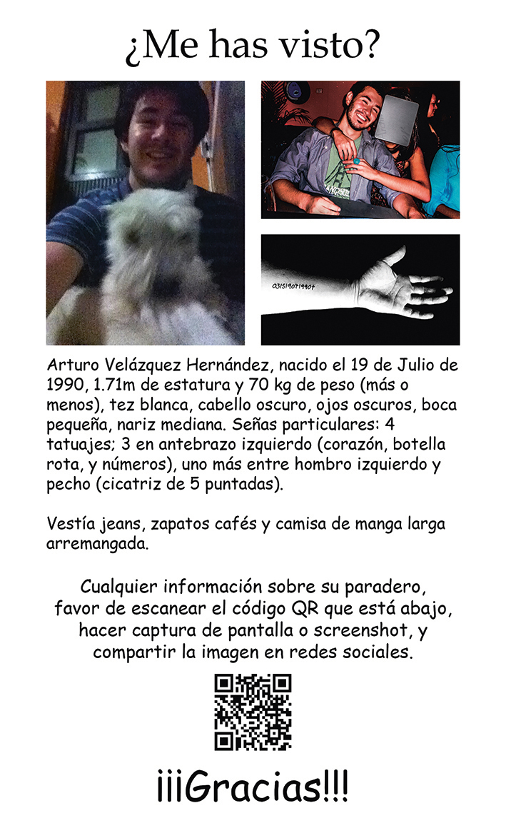 Maar de jonge man op de poster hierboven is niet verdwenen. Nog niet, zou hij zelf zeggen. Arturo Velázquez Hernández is een psycholoog en fotograaf die opgroeide, woonde en werkte in Mecapalapa, een dorpje in de Mexicaanse staat Puebla. Maar in 2019 kreeg hij te horen dat ook zijn leven gevaar liep, en moest hij vluchten. Sindsdien leeft hij in angst.