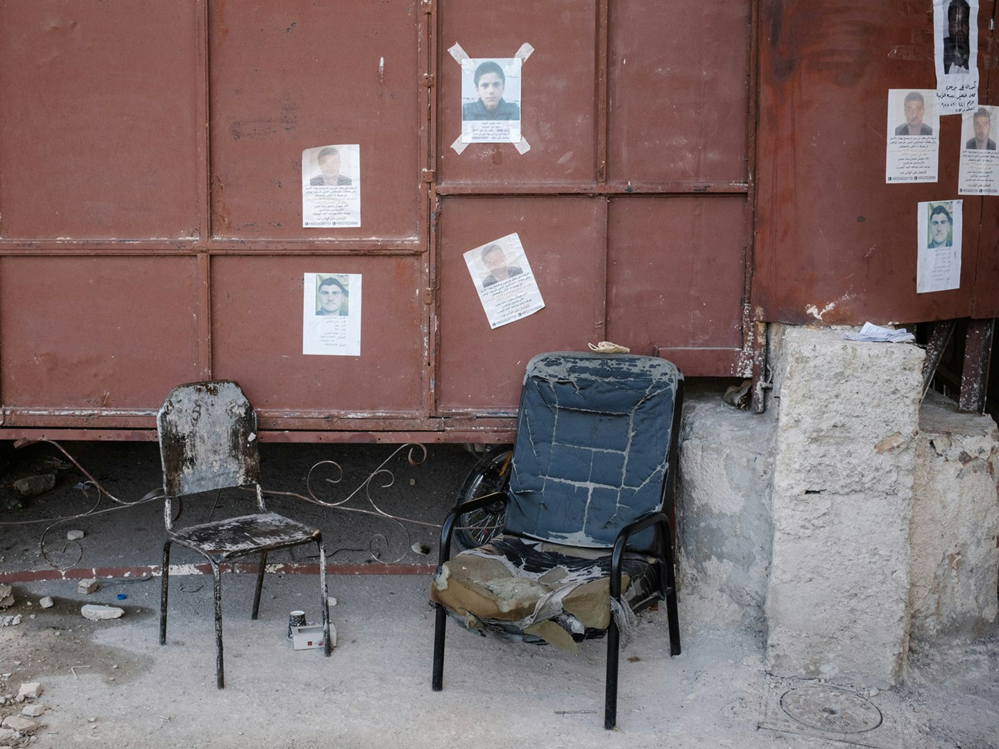 Een maand later is die chaos weggeëbd. HTS-soldaten bewaken de ingang van het terrein, maar de gevangenis is nog open voor bezoek. Familieleden van vermiste gevangenen die in december nog de wacht hielden voor de toegangspoort, hebben plaatsgemaakt voor affiches en foto’s op het metalen hekwerk. Op enkele plekken in en rond het cellencomplex tekenen gaten in muren en vloeren de wanhopige pogingen van zoekenden en reddingswerkers om mogelijk verborgen ruimtes bloot te leggen.