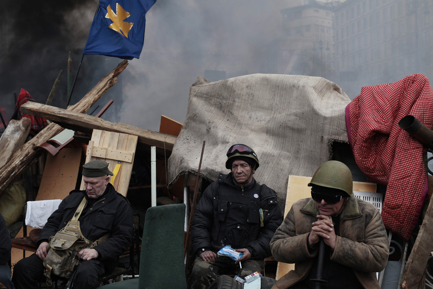 De mannen op deze foto bewaken de barricaden en je kunt zien dat ze geen soldaten zijn die gewend zijn om met geweld om te gaan. Ze zitten daar omdat ze niet anders kunnen, gewone mensen die zó graag een ander leven willen dat ze bereid zijn hun leven ervoor te riskeren. Kijk nog maar eens goed naar ze, hoe vermoeid en toch vastberaden ze daar uitrusten: deze foto vertelt dat je echt geen held hoeft te zijn om geweldloos verzet te plegen. Je moet het alleen maar willen doen, samen met anderen, en het dan gaan doen. Succes niet gegarandeerd, maar een mislukking ook niet: twee dagen na deze foto vluchtte de autocraat en zette Oekraïne een nieuwe stap richting Europa.