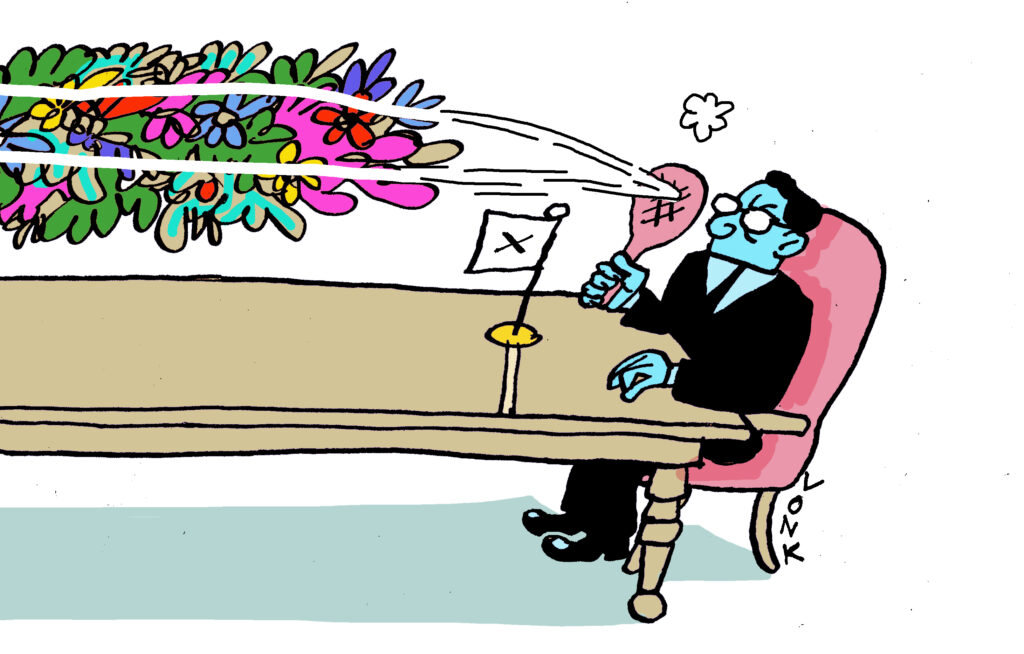 Een surrealistisch beeld. De Nederlandse mensenrechtenambassadeur Arjan Hamburger zit in een gigantische nepmarmeren ruimte in Beijing. Zijn Chinese evenknie zit er ook. Maar zien kunnen ze elkaar niet, want tussen hen in staat een grote bloempot die hen het zicht op hun gesprekspartner belemmert.