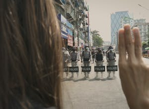 ‘In deze revolutie verloren sommigen hun leven, anderen werden gemarteld of gearresteerd of hun bezit werd afgenomen. Maar we moeten niet opgeven en voor een betere toekomst strijden’, opent Thet Swe Win de avond. Op het flatscreen verschijnt het gezicht van een jonge vrouw. Het beeld is korrelig en de audio hapert. Ze bevindt zich nog in Myanmar. Haar woordenstroom lijkt niet te stoppen, maar haar boodschap is duidelijk: haar generatie zal de strijd tegen de junta niet opgeven. ‘De militairen kunnen proberen ons te overheersen, maar wij zwaaien met de vlag “geen overheersing”. Ze kunnen proberen ons te hersenspoelen, maar onze generatie weet wat goed en fout is, wat recht en onrecht is, ongeacht etniciteit, religie of klasse. In onze toekomst zal er in de politiek geen plaats zijn voor het leger. Wij willen een federale staat met gelijke rechten voor iedereen en respect voor mensenrechten.’