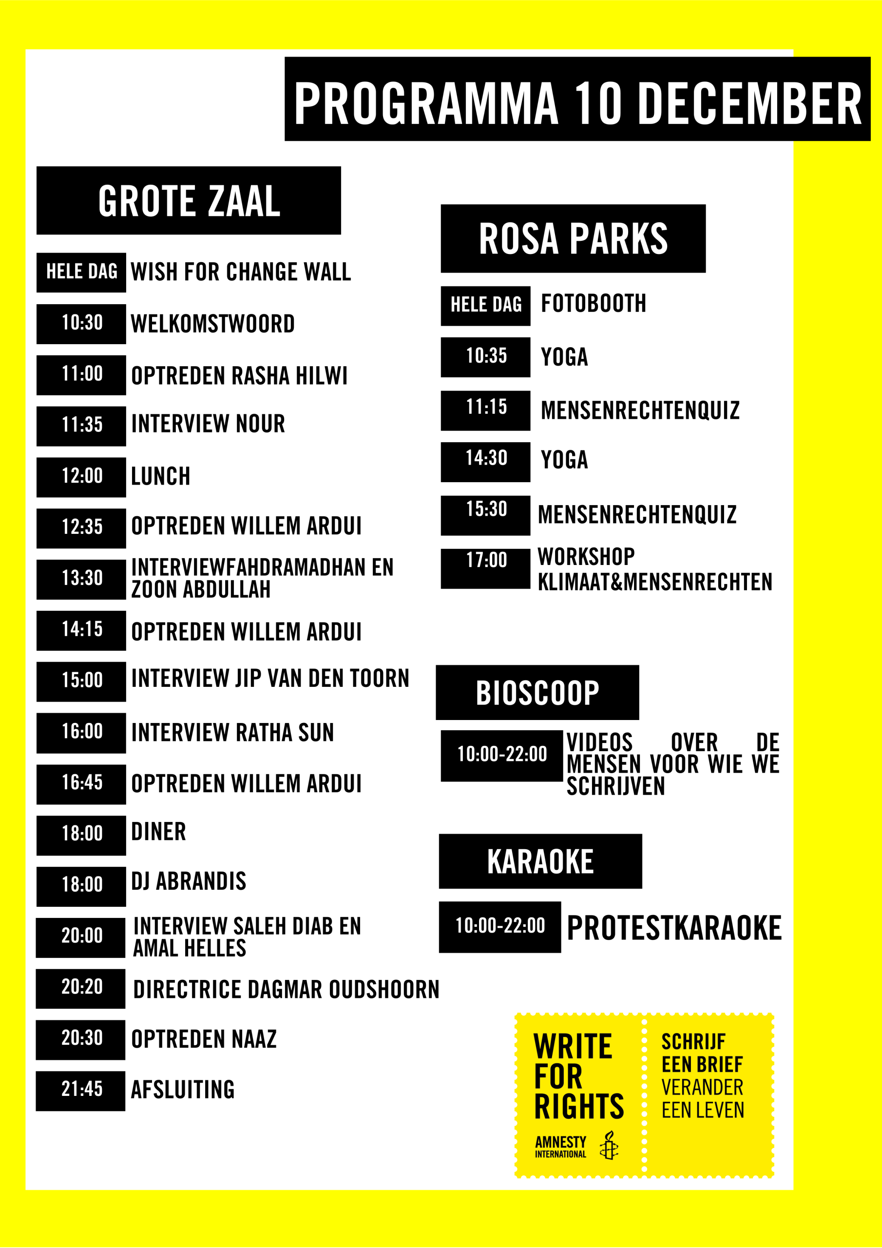 10 December is een dag waarop je samen met anderen schrijft voor gerechtigheid, het werk van Amnesty ervaart en onderdeel wordt van het grootste mensenrechtenevent wereldwijd. Een dag vol ontmoeting en inspiratie: van optredens en workshops tot verhalen van bijzondere sprekers. Met een warme ontvangst, lekker eten en drinken.
